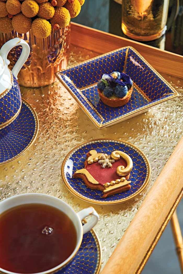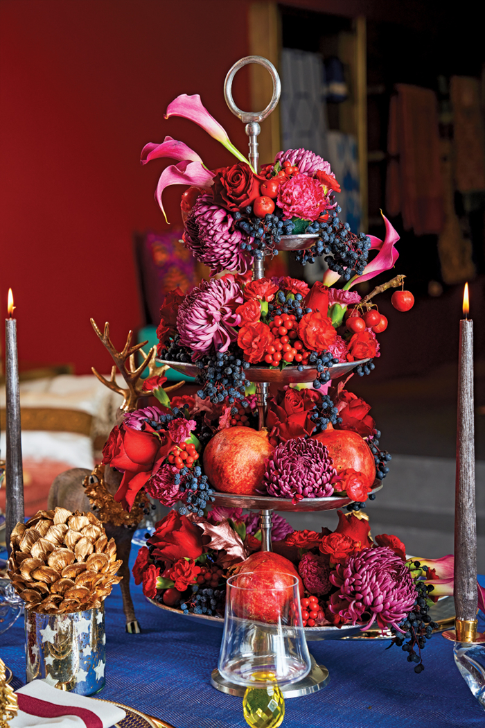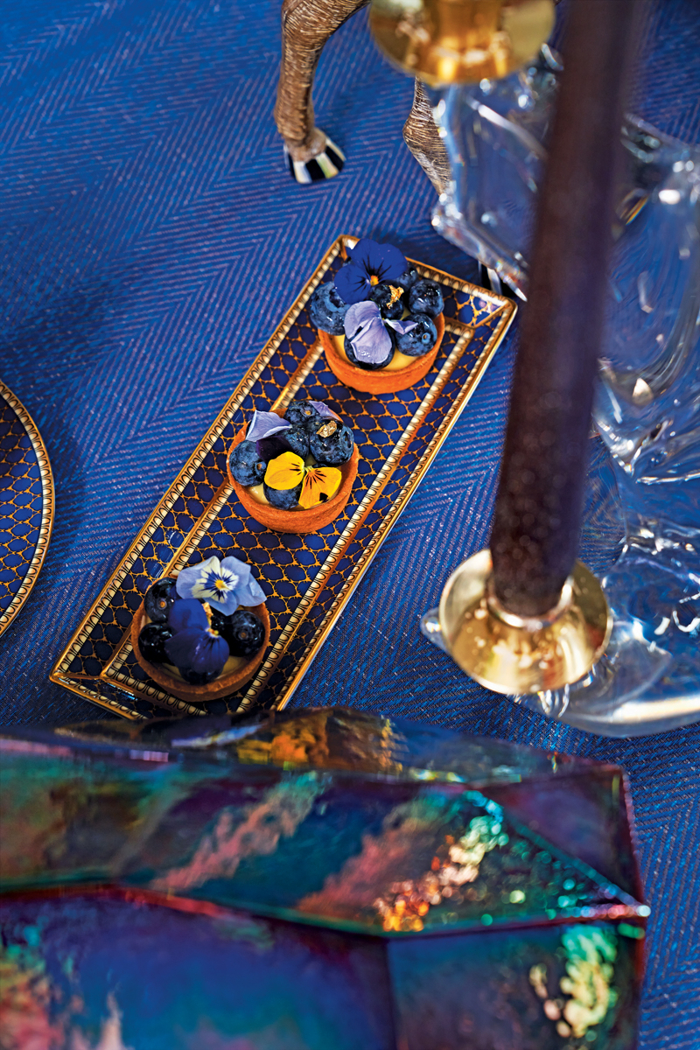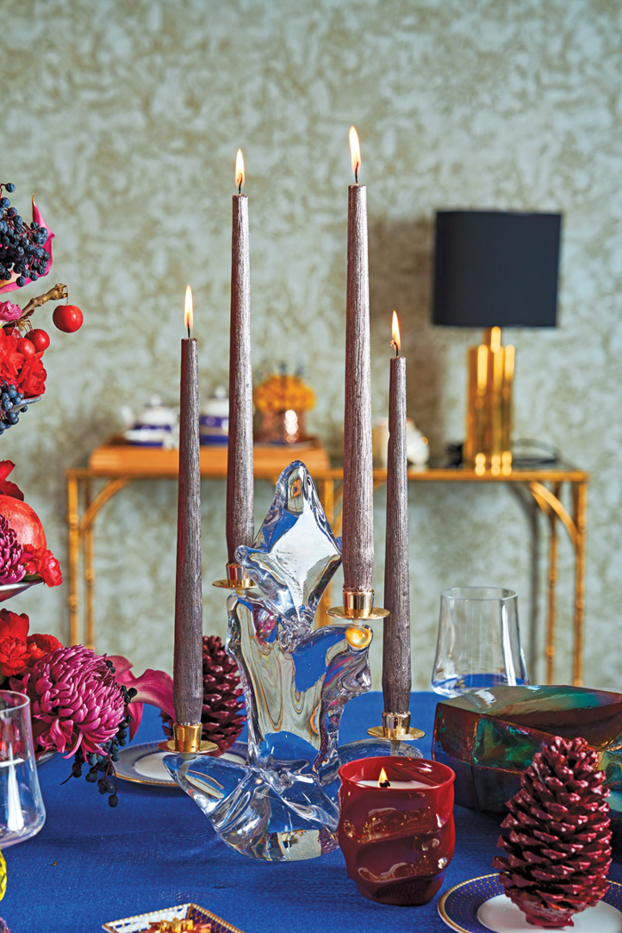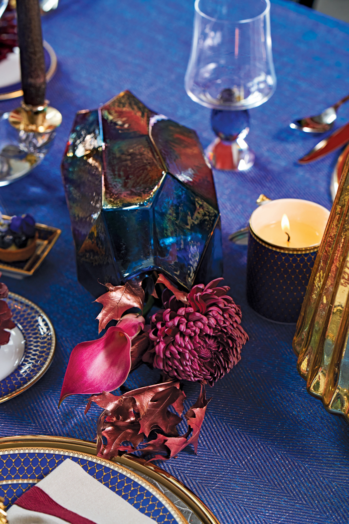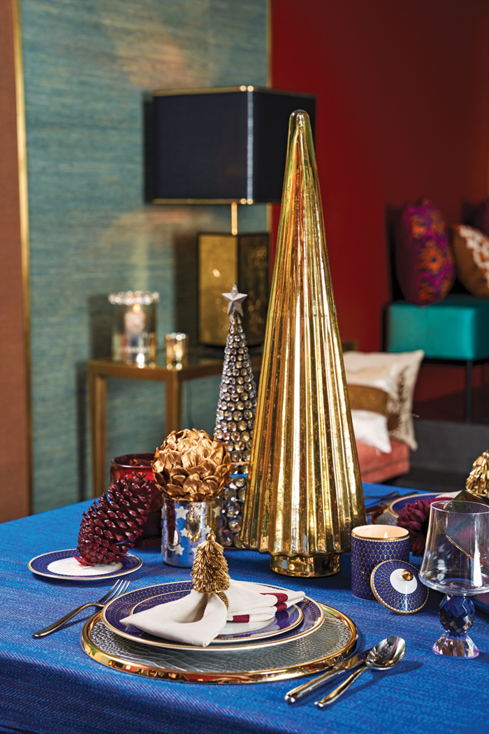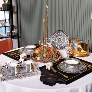Kobalt mavinin hakim olduğu, Halcyon Days'in en klasik ve zamansız Antler Treklis koleksiyonunun mavi tonuyla yola çıktık; bu tonu Haan'ın çok yakın masa örtüsüyle kombinleyip aradaki geçişleri gri gümüş Amerikan servisleriyle yumuşattık. Yine kullandığımız vazoların içindeki bordolarla, yılbaşının koyu kırmızı çiçeklerini birleştirerek çok daha iddialı bir tonlama yakaladık. Masanın ışıltısını ve şıklığını gümüş ile gold'un parıltısıyla tamamladık.
