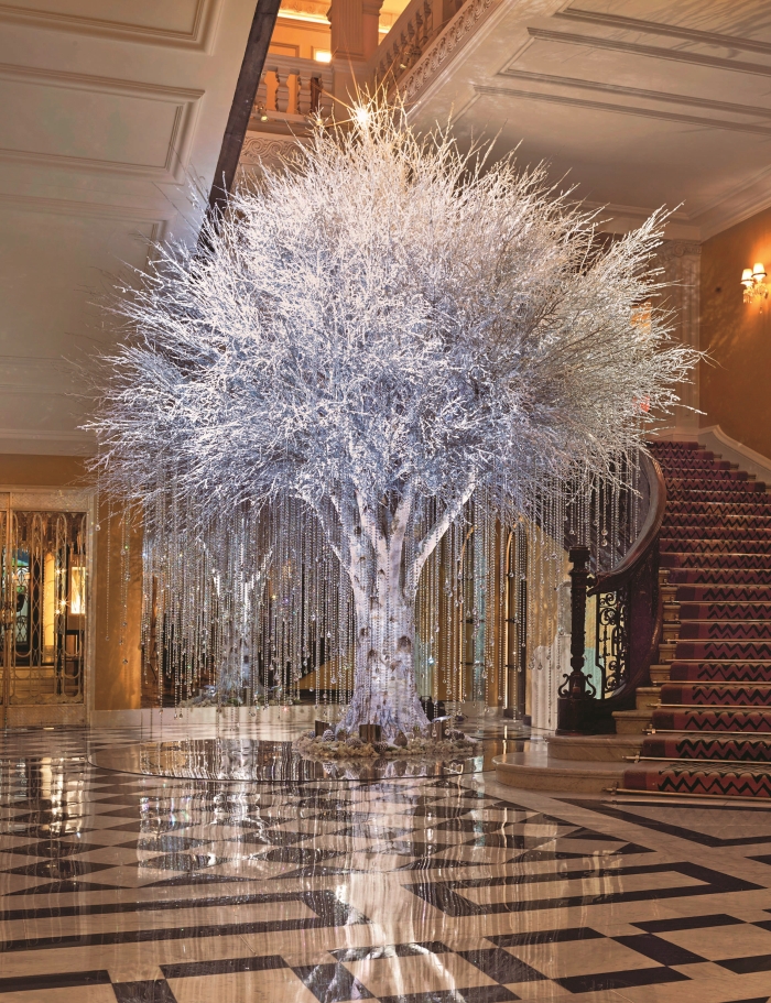 Mayfair’in ikonik adreslerinden Claridge’s’in yılbaşı ağacı otelin Art Deco mimarisinden ve I. Dünya Savaşı’ndan sonra insanların umut ve mutluluk aradığı “Kükreyen 20’ler” olarak adlandırılan dönemden ilham alıyor. McQueens Florals’ın kurucusu Kally Ellis’in tasarladığı ağaçtaki her dal 10 binden fazla kristalle süslü.