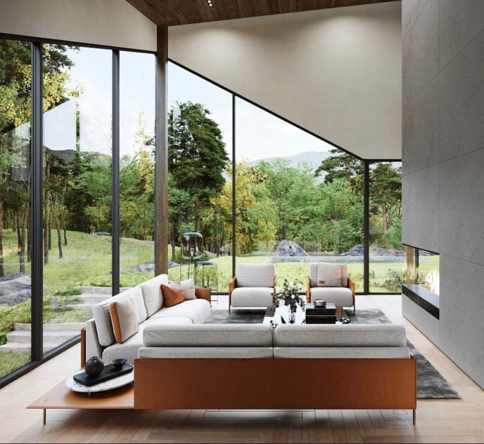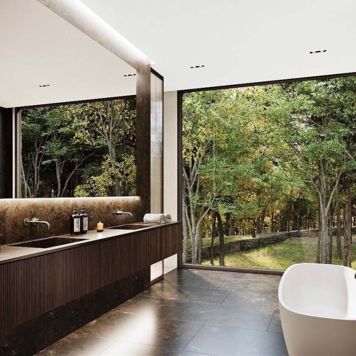Lüks içinde kamp yapıyormuşsunuz hissi veren boydan boya cam duvarları olan “Sylvan Rock” isimli villa, ağaçlar arasında gizlenmiş ve 783 metrekarelik bir alana yayılmış. Doğal çevreye uyumlu yapılmış dört odalı ve banyolu villa birbirine bağlı üç bölümden oluşuyor. Alt katında, girişteki garaja otomobilinizi park ediyorsunuz. Gerçi pandemi şartlarında Manhattan’ın ünlü Broadway’i ya da 34. Cadde’si eski hareketliliğinde olmasa da; iki saat uzaklıktaki şehrin havasını solumak istediğinizde, arabanız gözünüzün önünde sizi bekliyor. İçeride geniş bir salon, bar, şarap mahzeni, büyük bir yemek salonu ve mutfak yer alıyor.