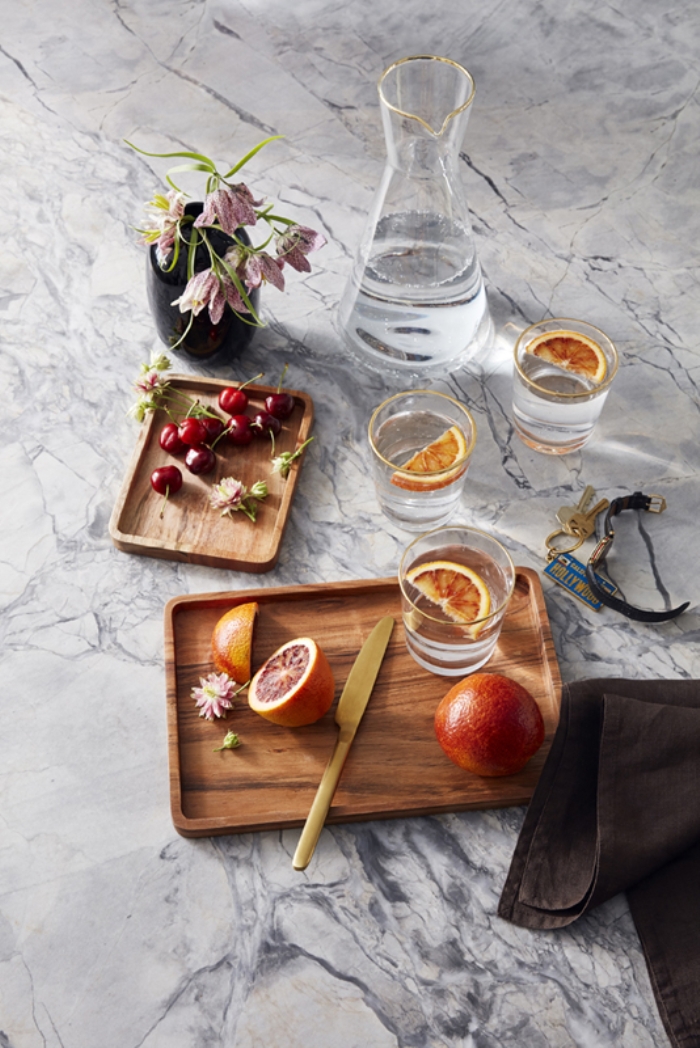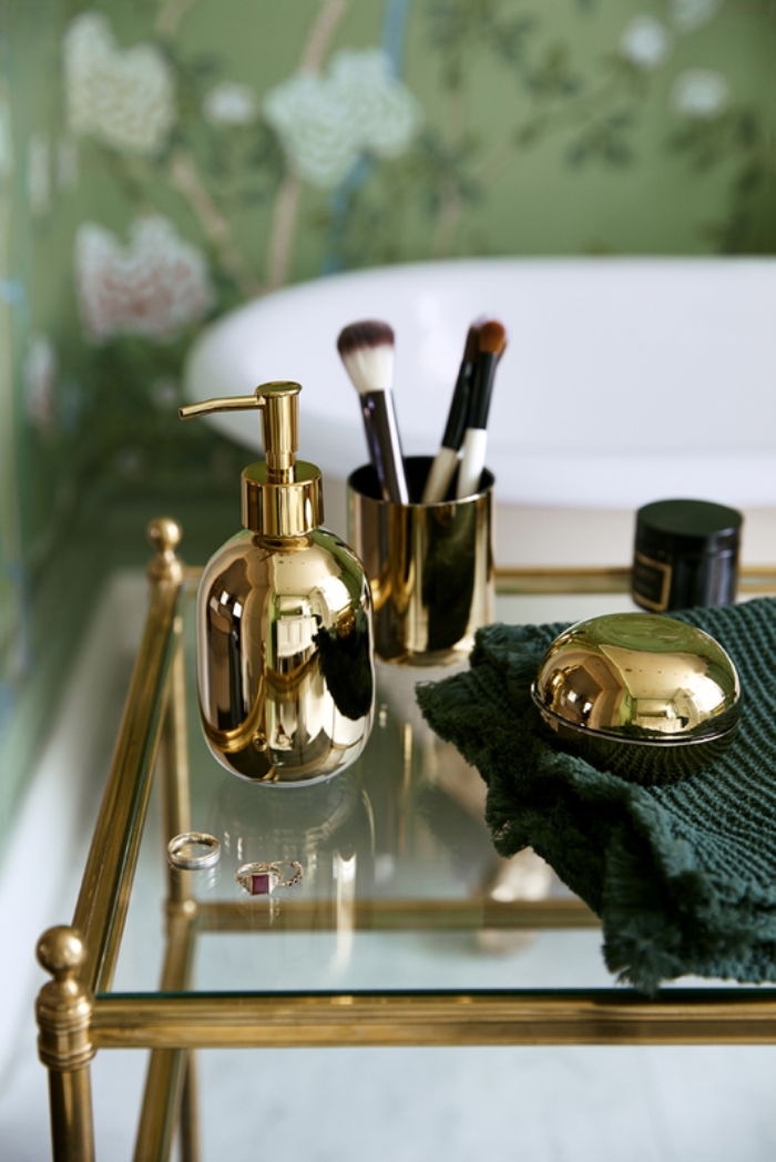 H&M Home’un yeni koleksiyonunun orman yeşili ve doğal tonları ve koyu pembe ve mantar grisi pirinç aksesuarları ve mobilyaları mutfak ve yatak odasından oturma odası ve banyoya tüm eve uyum sağlıyor.