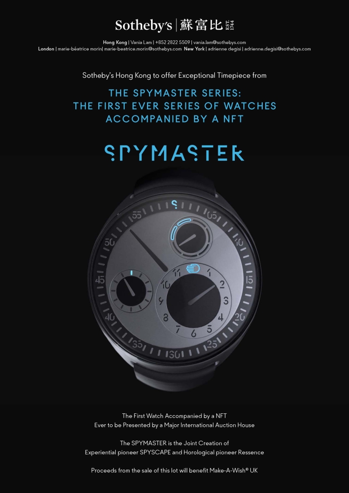 Sotheby's, 1 – 23 Nisan arasında Hong Kong'da düzenlenecek önemli saatler açık artırmasında NFT'lerin eşlik ettiği ilk saat serisi olan SPYMASTER'dan olağanüstü parçalar sunuyor. New York merkezli müze, deneyim öncüleri SPYSCAPE ve saat bilimi öncüleri Ressence arasındaki iş birliğinin sonucu olan SPYMASTER serisi, İsviçre menşeili el yapımı 21 adet titanyum saati içeriyor. Aralarında değeri 170.000 HK $ - 300.000 HK $ arasında olan 008# numaralı saatten elde edilen gelir, Make-A-Wish (R) UK aracılığıyla kritik hastalıkları olan çocukların dileklerini gerçekleştirmeye yardımcı olmak için bağışlanacak.