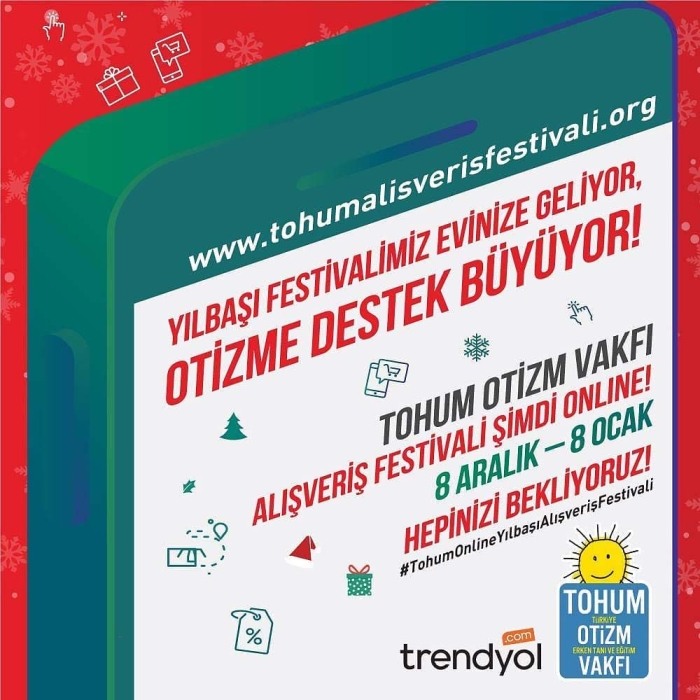 Otizmli çocuklar yararına gerçekleşen Tohum Otizm Vakfı Online Alışveriş Festivali, bu sene 8 Aralık - 8 Ocak günleri arasında Trendyol’da gerçekleşiyor. “Yılbaşı Festivali Evinize Geliyor, Otizme Destek Büyüyor!" sloganıyla otizmli çocuklar yararına düzenlenen Tohum Otizm Vakfı Online Yılbaşı Festivali’nden alışveriş yaparak, otizmli çocukların eğitimine destek olabilirsiniz.