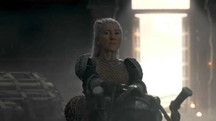 Dokuzuncu bölümde Aegon'un gösterişli ve kalabalık taç giyme törenine kontrast olarak onuncu bölümde Rhaenyra, bebeğinin cenazesinde taç giyiyor. Gerçek anlamda her açıdan kontrast iki sahne izliyoruz. İlkinde karanlık diyebileceğimiz kapalı bir alana zorla toplanmış halkı görüyoruz, Aegon isteksizce sahneye geliyor, ismini aldığı Kral Aegon'un tacını ve kılıcını alıyor, ne kadar resmi olduğu tartışmalı da olsa seremoniyle kral oluyor ama kimse önünde diz çökmüyor. Halkın heyecanlandığını görünce de kılıcını çekip adeta şov yapıyor; bu sevgi gösterisi, sevgi eksikliğiyle büyümüş Aegon'un tahtı istemesi için yeterli oluyor. Rhaenyra'nın taç giyme törenine baktığımızda bir seremoni değil, cenaze töreni görüyoruz. Ancak dağın zirvesindeler, her yer ferah, açık alan, tepede ve güçlü bir konumdalar. Rhaenyra'ya babası Viserys'in tacı takılıyor, kılıç çıkardığını görmüyoruz ve çevresinde az kişi de olsa herkes önünde diz çöküyor. Bu iki sahne, bu iki karakter ve nasıl bir lider olacakları, krallığı nasıl yönetecekleri konusunda yeterli bir özet veriyor. Tabii Aegon'un taç giyme töreninin Kral Viserys'in kuzeni Prenses Rhaenys ve ejderhası tarafından kesildiğini ve Rhaenyra'nın taç giyme töreninin ise herhangi bir engelle sonuçlanmadığını da göz önünde bulundurmak gerek. Bu iki törenin en büyük ortak noktası; Prenses Rhaenys.