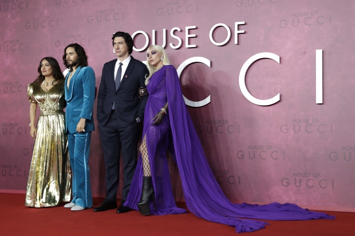 Gucci'nin küçük bir defile sergilediği Londra prömiyerinde Jared Leto turkuaz renkli kadife bir takım elbise giyerken, Salma Hayek 2021 sonbahar/kış trendine uyarak parıltılı altın bir elbise giydi. "House of Gucci"nin Maurizio Gucci'si Adam Driver'ın tercihi ise Burbery marka bir takımdan yana oldu.