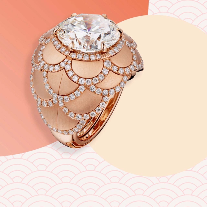 Kadınsı bir zarafete adanmış Shinsei koleksiyonu, ipek ve altın iplikle işlenmiş geleneksel kimonoların çiçeklerle bezeli bahar havasına saygı duruşu niteliğinde. Japon kaligrafisinin ebedi dirilişinin sembolü olan Shinsei içerisinde artistik güzelliğin pek çok öğesini barındırıyor. Adler'in 6.90 karatlık şahsiyetli pırlantası ise montürün görkemini perçinliyor. İstenildiğinde, sade bir tektaş yüzük olarak kullanılabilen tasarım 2 farklı yüzüğe aynı anda sahip olunmasını sağlıyor.