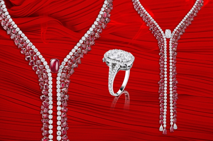 Adler, "Scarlett" adlı kolyesinde "haute couture" şifrelerini değerli taşlarla yarattığı tasarımına taşıyor. Kolyenin kusursuz tasarımı ve dekolteye doğru zarif düşüşü 2 pırlanta ve 2 yakutla sonlanıyor. Kolyenin merkezinde yer alan damla tektaş ise, bir pandantife veya bir yüzüğe dönüştürülebiliyor. Boynun iki yanından görkemli bir şekilde süzülen kolye, 55.38 karat 433 adet pırlanta ve 155.12 karat 168 yakuttan meydana gelen bir çağlayanı anımsatıyor. Karışık bir şekilde sıralanmış olan oval yakutlar iç sıradaki pırlantalarla kontrast oluşturuyor. Birinin simetrisiyle diğerinin taşkınlığı birbirini tamamlıyor. Adeta kumaştaki dikim ustalığının "Haute Joaillerie"ye taşıma hali gibi...