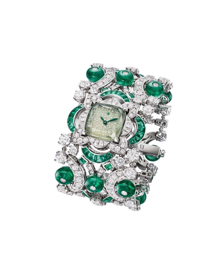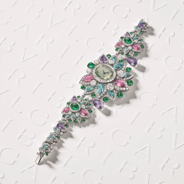 Feminenlik ve zarafeti temel alan ve uyumlu bir kolyeyle sunulan Blooming Beauty saat, Bulgari'nin mücevherler ile saatçiliği bir araya getiren yaratımlarını vurguluyor. Kadranı, 9,6 karat değerinde su yeşili turmalinin yer aldığı pırlantalarla kaplı. Oval kaboşon kesim Kolombiya zümrütleri, konforlu kullanım sunan esnek platin bilezikteki Paraiba turmalinleri, pembe ve mor spineller ve yuvarlak parlak kesim pırlantalar ile uyum sağlıyor.