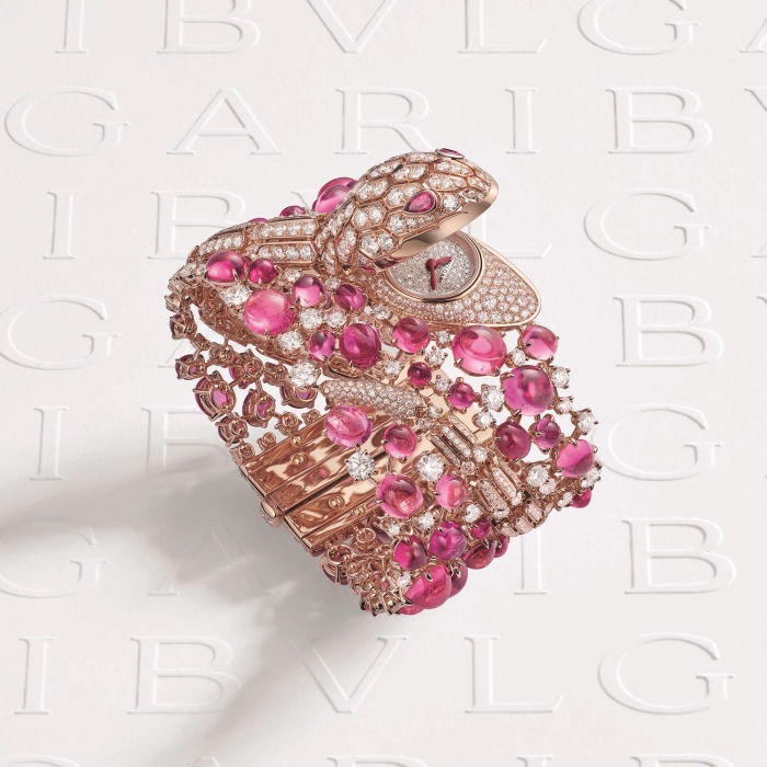 Bulgari'nin "yeniden doğuş ve bilgeliğin ebedi sembolü" olan yılanını kutlayan yeni Serpenti Misteriosi Riviera saat, değeri 95 karatı aşan canlı pembe ve kırmızı tonlarda rubelitleriyle bir Akdeniz gün batımının büyüleyici tonlarını yansıtıyor. Kadranı, yılanın başının altında saklanan gizli saat pembe altın, yuvarlak parlak kesim pırlantalar ve kaboşon rubelitleri feminen bir yaklaşım yaratıyor. Parçaları ince altın tellerle bir arada tutmayı sağlayan fil couteau tekniğinin kullanılması sayesinde taşlar havada süzülüyor izlenimi verirken, konforlu yapısını ve esnek bir bilezik tasarımını da koruyor.