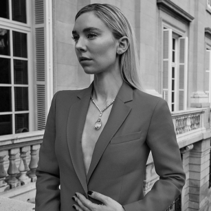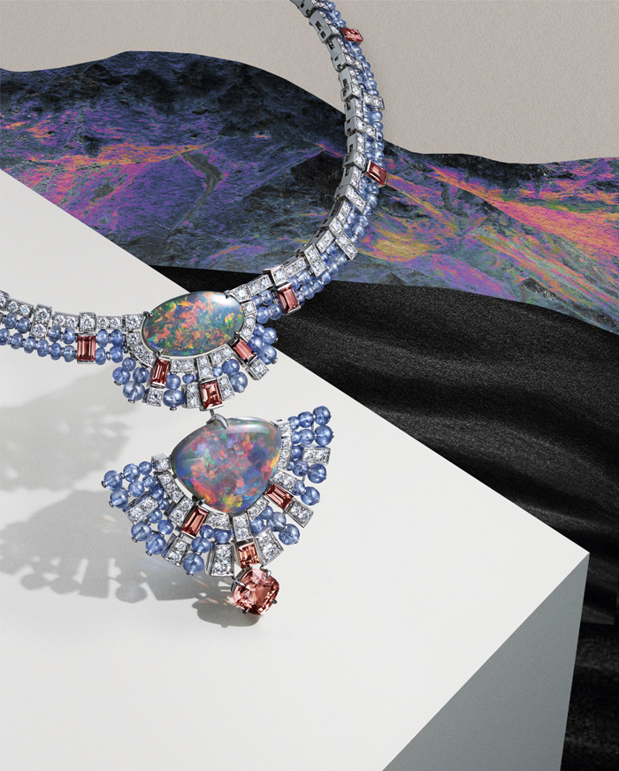 Rituel Mezoamerikan mücevherlerin güzelliğine şapka çıkarırken, narin ve zarif desenler, görünmez bir dizilim yöntemi sayesinde aralarında hiçbir bağ yokmuşçasına asılı duran pırlanta koniler ve fasetli yakutlar arasında salınıyor.