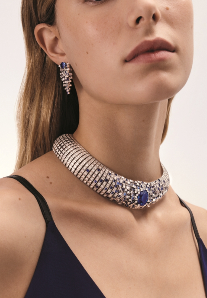 Lune Bleue temasında Sri Lanka ve Madagaskar safirlerinin yoğun mavisi kolye, yüzük ve küpelerde elmaslarla buluşuyor. Markanın simgelerinden dama motifli tasma kolye 900 saatlik bir çalışma ile koleksiyona dahil oluyor. Her taşın yüzde bir ışıltı oluşturacak şekilde yerleştirildiği kolyenin ortasında 15,56 karatlık Madagaskar safiri yer alıyor.