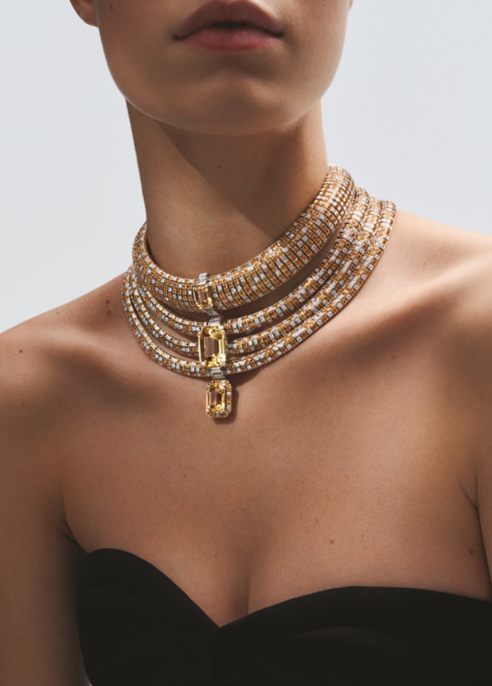 Çok sayıda elmas karelerle bezeli kolyede 8, 48, 14, 52 ve 35, 38 karat üç sarı safir yer alıyor. Kolye üç farklı şekilde kullanılabiliyor. 13 parçalık Astre Rouge, Mars’a selam gönderiyor. İki senelik bir araştırma sonucunda bulunan Mozambik yakutu kırmızı gezegenin enerjisini yansıtıyor. Yeryüzünün ruhunu yansıtan Céleste ve renklerle ışığın kusursuz buluşmasına sahne olan Interstellaire koleksiyonun diğer temaları.