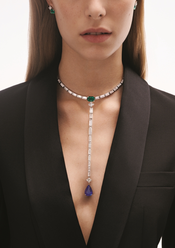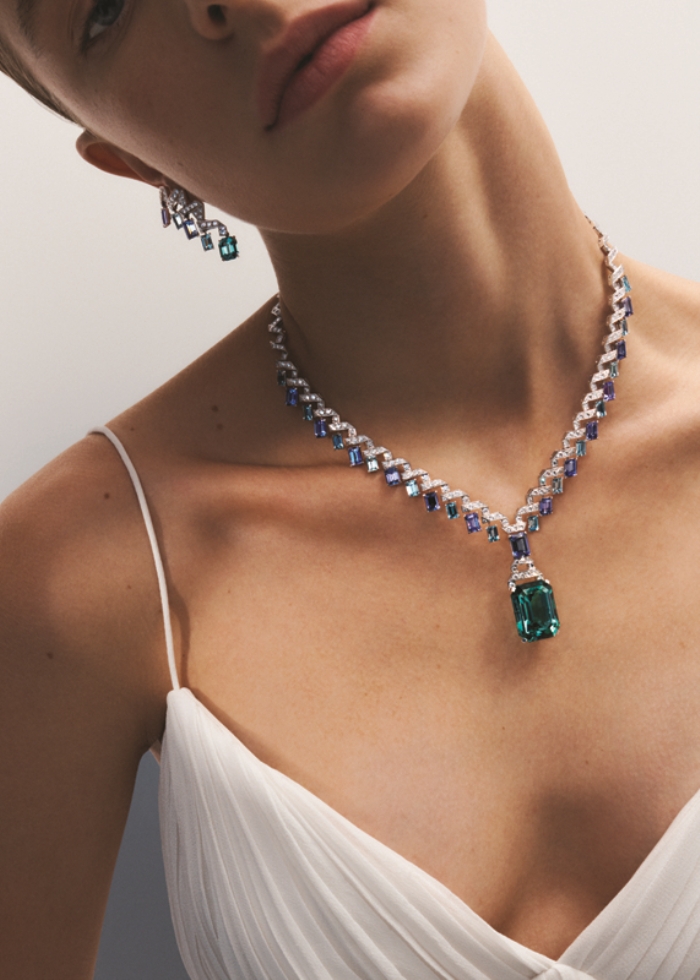 İndigo yeşili ve menekşe mavisini bir araya getiren Apogée serisindeki kolyenin elmaslarla bezeli her bir beyaz altın zigzağının eğrisinde V harfi karşımıza çıkıyor. Tanzanit taşları ve zümrütlerin de kullanıldığı kolyenin ortasında 34,88 karat indigo turmalin göze çarpıyor. Gökyüzü ve yeryüzü arasındaki bağları sembolize eden altı parçalık Planète Bleue’deki kolye 4, 63 karat Zambiya zümrüdü ve 13,77 karatlık Madagaskar safirini elmaslarla buluşturuyor. Güneşin gücü ise koleksiyonda beş tasarıma hayat veriyor. Soleils’in yıldızı markanın imza dama motifiyle süslü dört sıralı kolye.