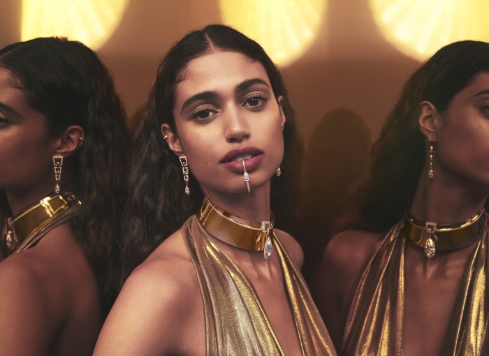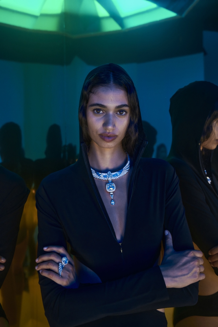 Divine Enigma, tasarımlar üzerinde oynayan hipnotik ve gizemli bir set. Sarı, beyaz altın ve elmasların parlaklığıyla oluşan iki gerdanlık, ortasında iki zümrüt kesim taş bulunan yedi sıra altını görülüyor.