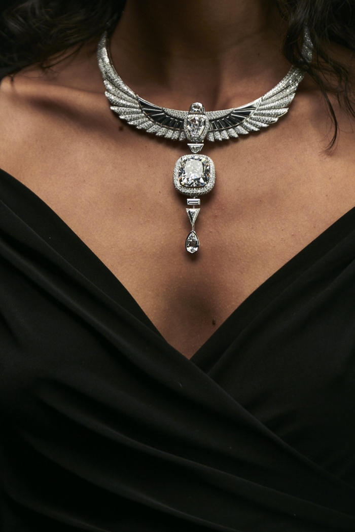 Valérie Messika, Antik Mısır'ın büyüleyici ve gizemli cazibesini keşfettiği Beyond the Light Koleksiyonu'nu piyasaya sürüyor. Yüksek mücevhercilik koleksiyonun başrölünde Akh-Ba-Ka serisinde yer alan, çevresinde takımyıldızı gibi sıralanan 15 pırlanta ile 33 karatlık elmas kolye yer alıyor.