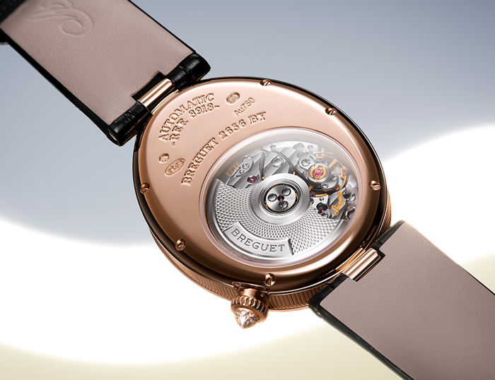 Reine de Naples 8918'in en çarpıcı yanı, gereksiz hiçbir göstergeye ihtiyaç duymadan sadeliği başrole taşıması. Ay fazı ya da güç rezervine yer vermeyen bu model, sadece saat ve dakikanın elmaslarla çevrelenmiş guilloché alt kadranda zarafetle konumlanmasıyla gücünü incelikten alan bir tasarım anlayışı sunuyor. 6 yönündeki armut kesim elmas, tüm kompozisyonun odak noktasını belirleyerek adeta bir mücevher gibi ışıldıyor. Takıya yakın incelikte tasarlanan bilezik seçenekleri ve her detayda görülen ustalık ise Breguet'nin yüzyıllardır sürdürdüğü saatçilik geleneğinin canlı bir yansıması.