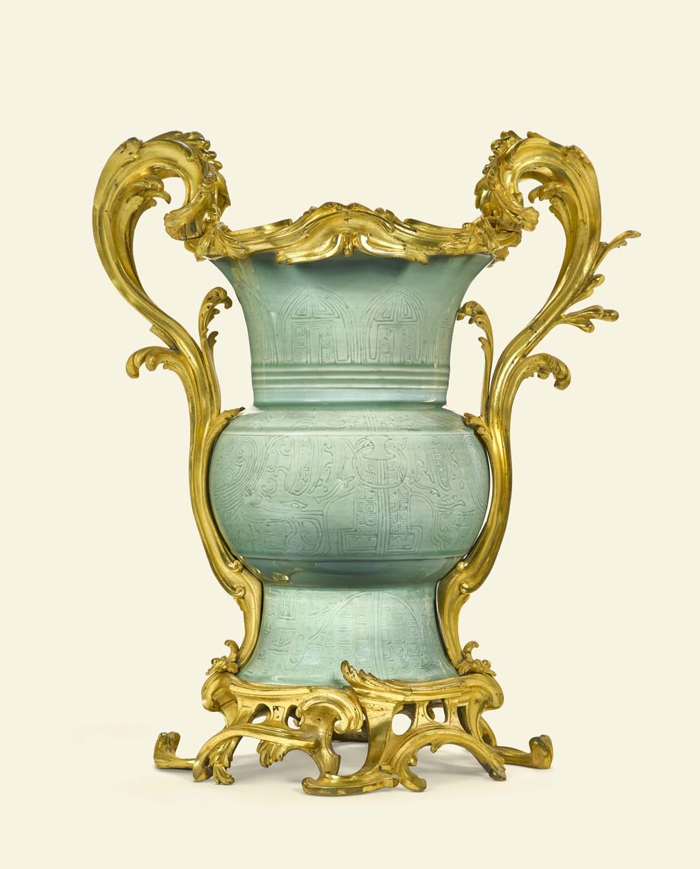 18. yüzyılda yapılmış bir Çin seladon vazosu, Louis XV döneminde Fransa'da yaldızlı bronz montajlarla süslenmiş.Irene Aitken'in, yaşamının sonuna kadar sürdürdüğü koleksiyonculuğunda kalite, provenans ve tarihsel bağlama öncelik verdiğini biliyoruz. Aitken dairesi, ağırlıklı olarak 18'inci yüzyıla odaklanan British ve French society portreleriyle tanınıyordu.