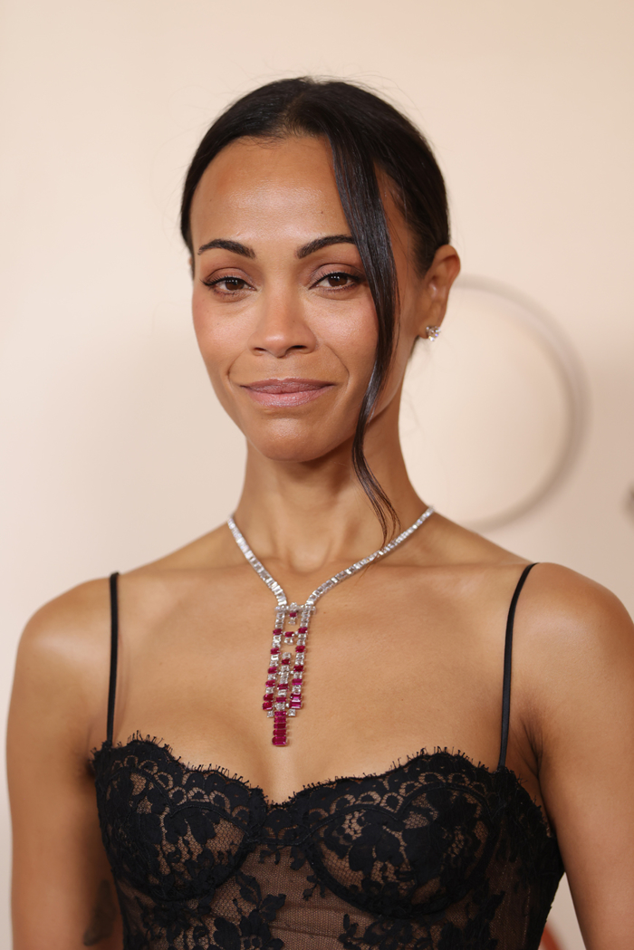 Gecenin sunucularından biri olan Saldaña, ilham alınacak stiliyle birçok kadının yakın markajında. Bu özel gecede de yine stilinden ödün vermedi. İç giyim stilindeki spagetti askılı dantel elbisesini, bronz allık ve düşük topuzla tamamlamıştı. Yüzünün yanına düşen saç tutamları, görünümün gücünü artırırken dudaklar nude tonuyla son noktayı koyuyordu.