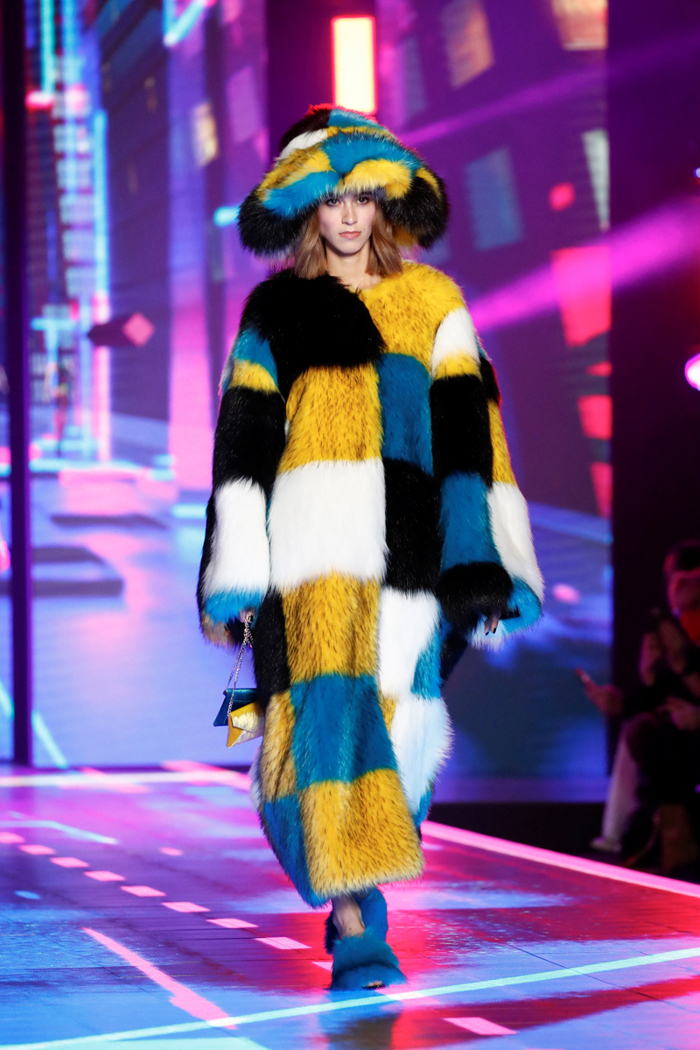 Dolce & Gabbana'nın eğlenceli kürk paltosu ve şapkası, gökkuşağının tonlarını akla getiren renklerde damalı kek ve beze şapkayla menüye dahil oluyor.