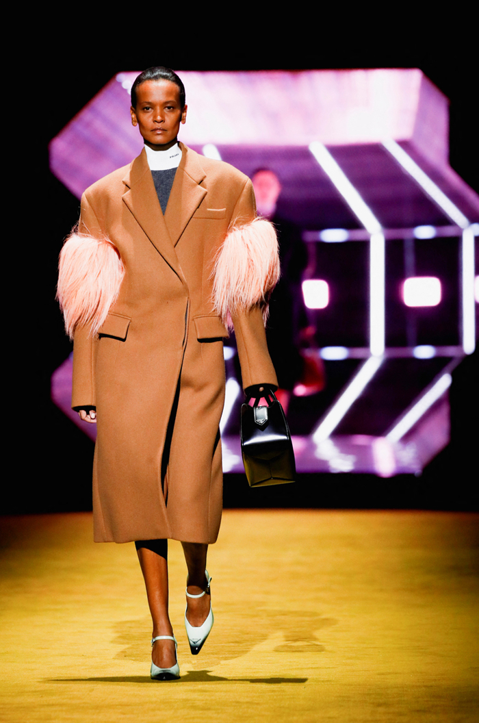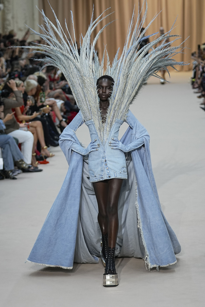 Jean Paul Gaultier'nin denim couture elbisesi siyah frenk üzümü dolgulu ve çikolata parçacıklı bir pasta olarak yorumlanıyor. Prada'nın devetüyü paltosu pembe kürk detayları da unutulmadan çikolatalı bisküviye dönüşüyor.