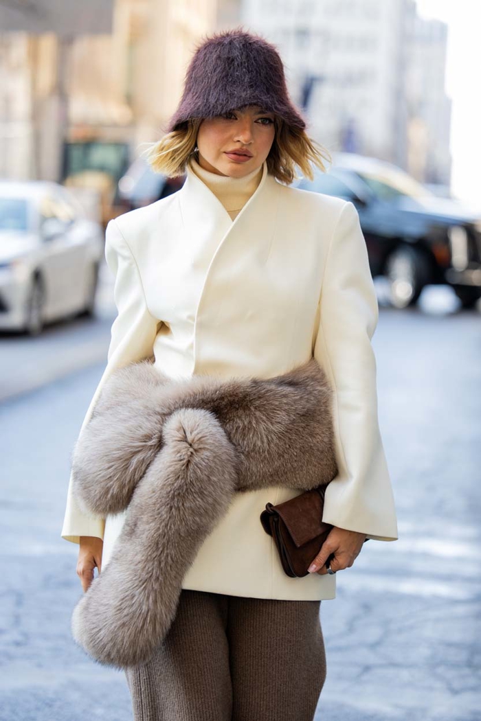 Balıkçı kökenli bucket şapkalar, yaz enerjisini hiç kaybetmeden dönüşüyor. Kış aylarında kürklü kaplamalar ve daha uzun kalıplarla günümüz hava koşullarına uyum sağlıyor; hacimli paltolarla birlikte güçlü bir kontrast yaratıyor. Yazın ise keten ve naylon gibi hafif kumaşlarla daha akışkan bir forma bürünüyor. Plajdan şehre taşınabilen nadir modellerden biri. Modern bucket'ın sırrı dengede: Hacimli bir model seçtiyseniz, kombini sade tutmak görünümü daha sofistike kılar. Spor geçmişi olan bu form, artık rahat lüksün sembolü diyebiliriz.