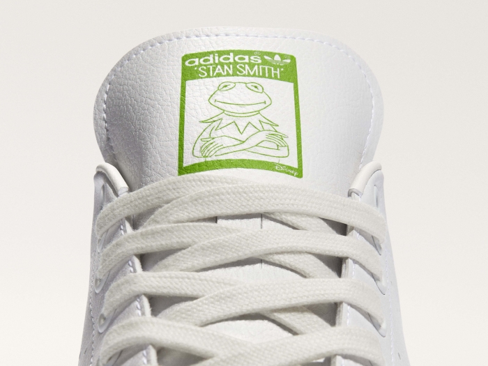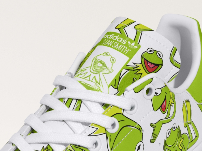 Stan Smith silueti, Kermit'in topukta kabartmalı ismi ve sol dilde basılmış portresinin yanı sıra ortak markalı çorap astarları, ek yeşil bağcıklar ve kabartmalı "It's Not Easy Being Green" ibaresiyle hayat buluyor. Adidas'ın gezegenimiz için daha iyi bir geleceğe olan bağlılığını destekleyen ikonik siluet, geri dönüştürülmüş materyallerden oluşan 'prımegreen' üst yüzey beyaz renkte kauçuk dış tabanın üzerine yerleştiriliyor.