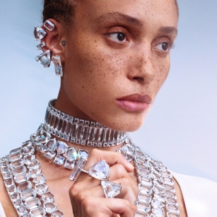 Feminen silüetlerle birleşen Swarovski kristalleriyle kaplı heykelsi topuklar, her ayakkabıyı benzersiz bir mücevher parçasına dönüştürdü.