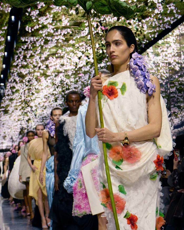 Podyumda sunulan koleksiyon, baharın hafifliğini doğrudan yansıtmaktan ziyade, doğanın dönüşüm fikrini merkeze alıyor. Çiçekler; kabarık eteklerde, ipekten kesilmiş gerçekçi aplikelerde ve yoğun el işlemelerinde karşımıza çıkıyor. Dior arşivlerinden tanıdık Bar ceketler uzatılmış oranlarla yeniden ele alınırken, drapeler ve büzgüler silüetleri yumuşatıyor. Koleksiyonun en dikkat çekici unsurlarından biri ise malzeme seçimleri: 18. yüzyıl Fransız kumaşlarından üretilen çantalar, meteorit parçalarıyla tasarlanan mücevherler ve heykelsi aksesuarlar, couture'ü koleksiyonluk birer sanat nesnesi olarak konumlandırıyor. Ayakkabılardaki trompe-l'oeil detaylar ve örgünün couture dünyasına dahil edilmesi ise Anderson'ın el işçiliğini genişletme arzusunun bir göstergesini sunuyor.