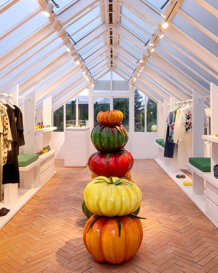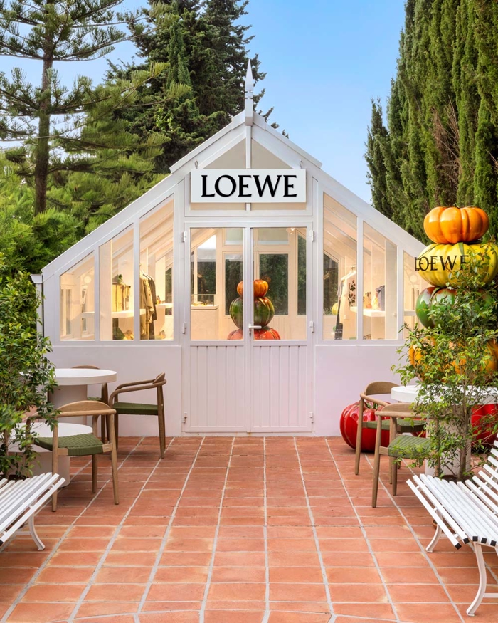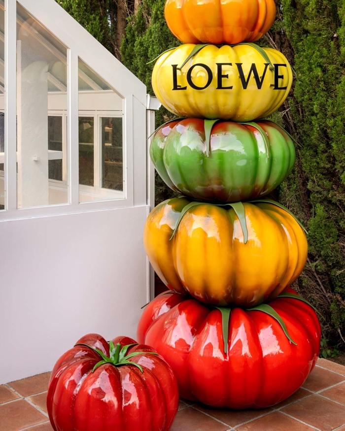 Rafineli Punch Hole Shopper çantalar, Landscape Puzzle ve yeni erkek Flex Loafer serisi, yaz kombinlerini tamamlayan anahtar aksesuarlar arasında. İbiza'daki mağaza, Marina Ibiza'nın ikonik bulvarında, Ekim ortasına kadar erkek ve kadın hazır giyim, çanta ve aksesuarlardan oluşan kapsamlı bir koleksiyon sunuyor. Mağazanın iç mekanını domine eden dev Balear Adası, kertenkele heykeli ve İtalya'da üretilmiş mavi altıgen seramikler, Akdeniz ruhuna zarif bir gönderme niteliğinde. İspanya'nın diğer köşelerinde, Marbella Club Hotel'in tarihi cam serasında kurulan sergi, oyuncu bir atmosferle koleksiyonu sergiliyor. Formentera'da ise şıklığın ve minimalizmin hakim olduğu bir pop-up deneyimi var; girişteki heykelsi domates yığını, mekana mizahi ve çağrışımlı bir dokunuş katıyor. Loewe'nin bu yazki pop-up stratejisi, moda deneyimini sadece alışverişle sınırlamıyor; her mekan, ziyaretçiyi tasarım, sanat ve yerel estetiğin bir arada yaşandığı bir serüvene davet ediyor.