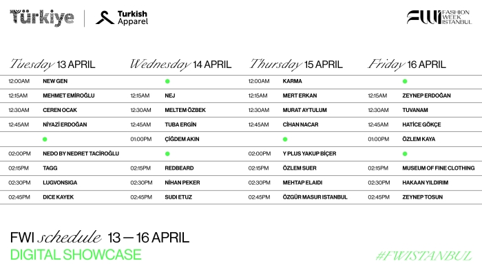 Tüm dijital platformlarda yaratıcı, farklı içeriklerle karşımızda olmaya hazırlanan, Türk modası ve sektörün yaratıcılarını tüm dünyaya taşıyacak olan Fashion Week Istanbul'un takvimi; www.fashionweek.istanbul adresinden, resmi Instagram hesabı @fwistanbul'dan ve #fwistanbul hashtag'i üzerinden takip edilebilecek.