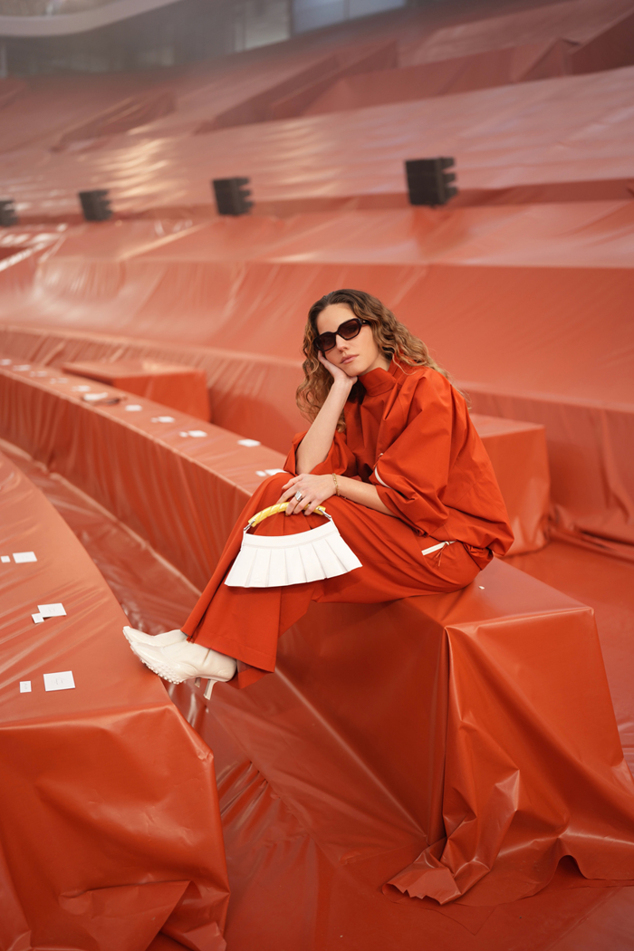 Özge GürelBu yaklaşım en çok dış giyimde kendini gösteriyor. Son sezonlarda bu alanda belirgin bir yön çizen marka, Sonbahar/Kış 2026'da su geçirmezlik ve teknik kumaş geliştirmelerini daha görünür hale getiriyor. Trençkot koleksiyonun omurgasını oluştururken, panço polo formunun yeni bir yorumu olarak öne çıkıyor. Birleştirilmiş teknik yün yüzeyler, şeffaf naylon kumaşlar, dolgulu hacimli siluetler ve ıslak görünümlü ya da yansıtıcı dokular, koleksiyonun hava koşullarıyla kurduğu ilişkiyi belirginleştiriyor. Bu teknik katmanlar, kadifenin daha zengin hissi ve René blazer'ın yumuşak terzilik çizgileriyle bir araya geldiğinde, ortaya hem sportif hem de rafine bir denge çıkıyor.