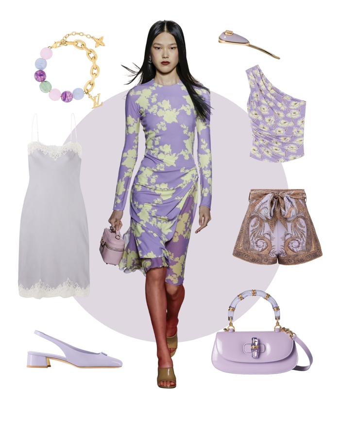 Saat yönünde; Toka, Miu Miu; Bluz, Versace; Şort, Zimmermann; Çanta, Gucci; Ayakkabı, Louis Vuitton; Elbise, Stella McCartney; Bileklik, Louis Vuitton; Runway, Versace.2025 İlkbahar/Yaz defileleri, lavantanın yeniden yükselişini başlatan dönüm noktası oldu. Versace, canlı yeşillerle kombinlediği lavanta parçalarıyla bu tona gençlik ve enerji yüklerken; Bottega Veneta, gri ve mavi tonlarla eşleştirerek ona şehirli, sofistike bir hava kazandırdı. Issey Miyake ise siyah tabanlı görünümlerine eklediği yeşil detaylarla lavantanın bahar tazeliğini zarifçe vurguladı. Bu sayede lavanta, hem romantik hem de beklenmedik derecede keskin yorumlarla moda sahnesinde farklı yüzlerini gösterdi.