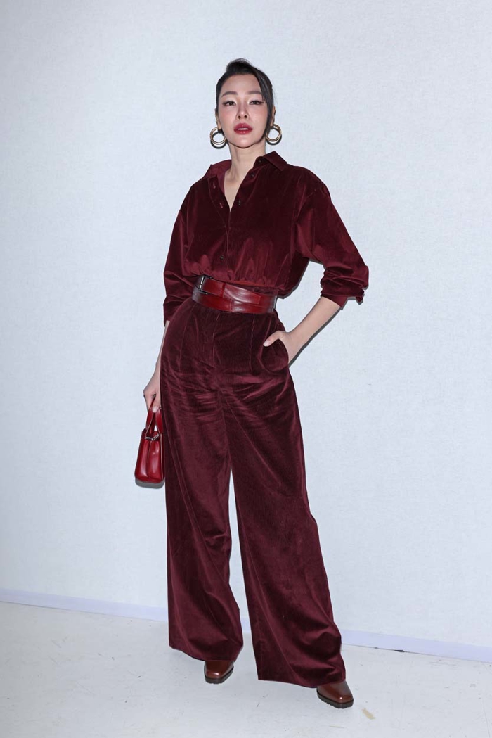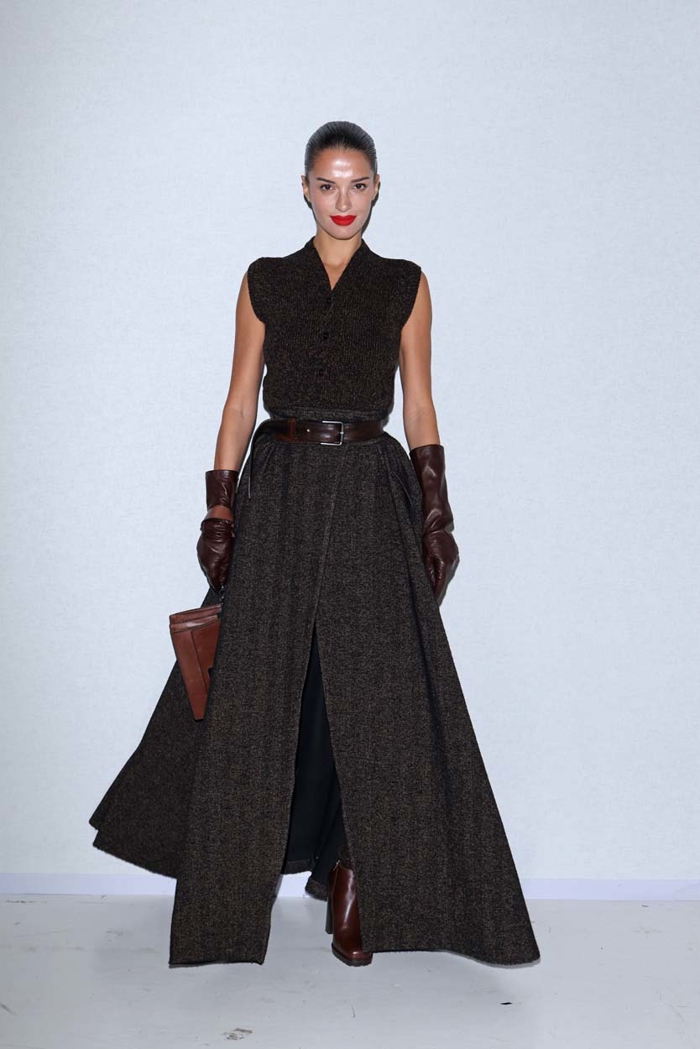 İzleyicelerde ön sıralara baktığımızda ise içinde bulunduğumuz sonbahar sezonuna ilham veren konuklar, Max Mara'nın 2025 Sonbahar/Kış koleksiyonundan görünümlerle güncel bir vitrin yaratıyor. Kahverenginin derin tonları ve bordo, Gabrielle Caunesil ve Faye Peraya'da hayat bulurken, Sara Gündoğan açık renk paletiyle kontrast kuruyor, bordoyu çantasında yıldızlaştırıyor. Tüm bu görünümlerde asıl ortak nokta ise Max Mara'nın "ladylike" zarafetini kişisel dokunuşlarla yeniden yorumlamaları.