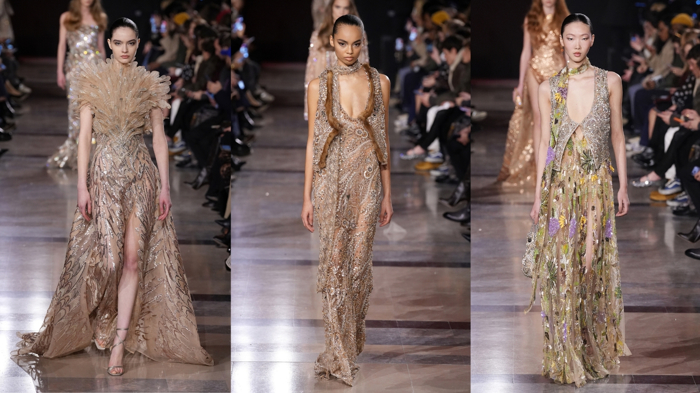 Haute couture koleksiyonunda 1970'lerin jet sosyete yazlarından ve Marakeş'in bohem estetiğinden ilham alan Elie Saab, altın tonlarının hâkim olduğu koleksiyonda mücevherli elbiseler, kristal işlemeler, metalik fileler ve ışıldayan yüzeyler öne çıktı. Ancak görkemli detaylara rağmen silüetler hafif ve akışkan bir yapı sundu. Püsküller ve ombre geçişli şifonlar tasarımlara hareket kazandırırken, mücevher benzeri el işçilikleri couture zanaatini vurguladı. Birçok görünüm katmanlanabilir şekilde tasarlandı; elbiseler yeleklerle, payetli üstler uyumlu pantolonlarla kombinlendi. Koleksiyondaki bej-gül tonlarındaki gelinlik ise klasik ihtişamdan uzak, daha yumuşak ve hafif bir yaklaşım benimsedi. Elie Saab, bu sezon ihtişam ile rahatlık arasında dengeli bir çizgi kurdu.