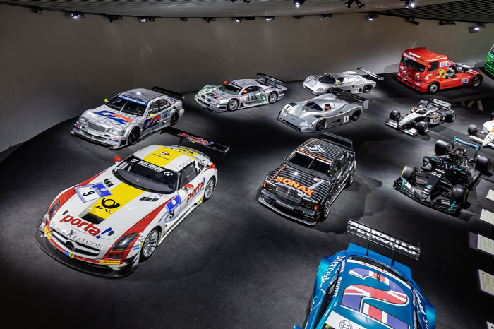 Açılışını 19 Mayıs 2006'da gerçekleştiren Mercedes-Benz Müzesi, üç yapraklı yonca biçiminde planlanmış çarpıcı mimarisi, içindeki "DNA çifti sarmalı" düzeniyle ziyaretçiyi tarihi bir zaman yolculuğuna çıkarıyor. Toplam dokuz kat sergi alanı üzerinden kronolojik olarak düzenlenen müze, bir rota olarak "Efsane Odaları" (Legend Rooms) ile kurumsal ve toplumsal hikayeleri anlatıyor; diğer rota ise "Koleksiyon Odaları" (Collection Rooms) aracılığıyla araç çeşitliliğini vurguluyor. İki yol, iç kısımdaki sarmal rampalar sayesinde birbiriyle kesişerek ziyaretçiye rotalar arasında geçiş imkânı tanıyor. Sergilenen 160'tan fazla araç ve 1.500'ü aşkın objeyle ziyaretçiye markanın 135 yıldır süren yolculuğu boyunca otomobilden esinlenen teknolojik ve toplumsal gelişimleri bütünsel biçimde sunuyor.
