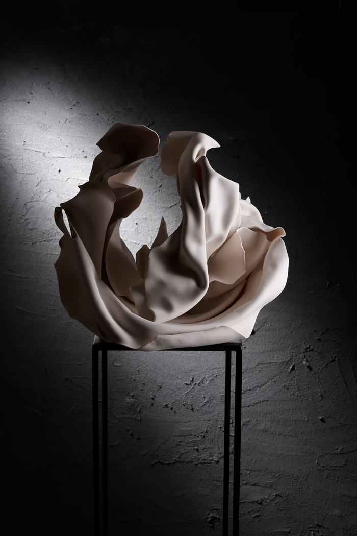 Porselen serbest teknikte şekillendirmesi zor bir malzeme, özellikle büyük formlara çıktığınızda süreç daha da karmaşıklaşıyor. Ama aynı zamanda düşüncelerimin saflığını, geçirgenliğini ve inceliğini çok iyi taşıdığına inanıyorum. 1250°C'de pişen porselen hem çok narin hem de beklenmedik kadar dirençli. Bu zıtlık, benim insanın hayata karşı duruşuna dair hissettiğim şeyleri tam olarak yansıtıyor.