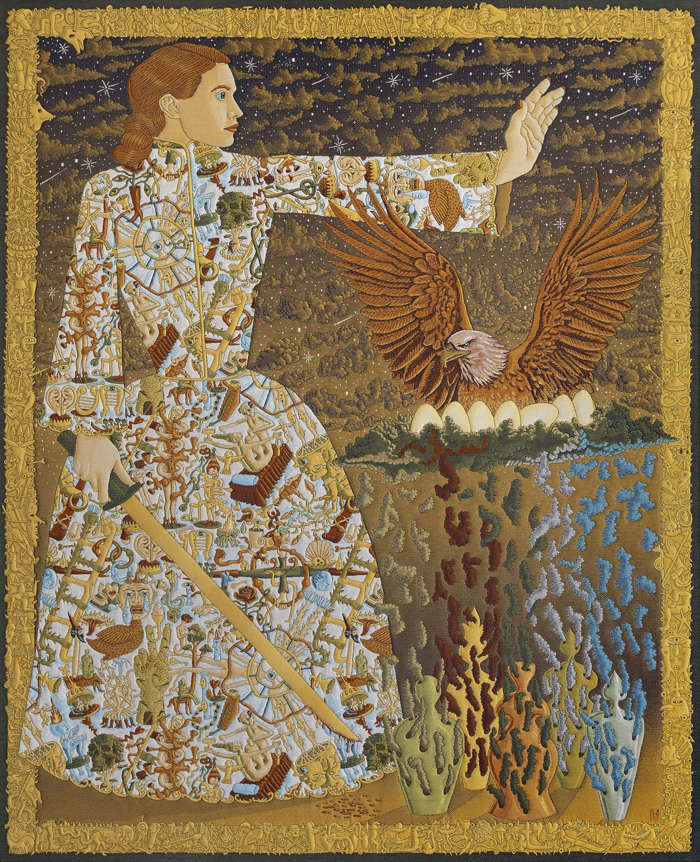 Bayram Demir, The Guardian, 2025, sekiz renkli kapitone örme jakarlı kumaş, 240 × 195 cm.