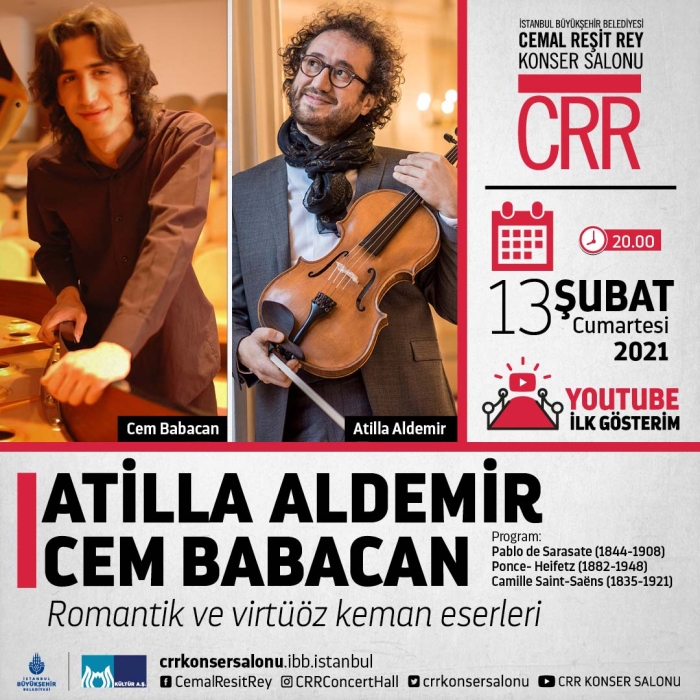 Cemal Reşit Rey (CRR) Konser Salonu'nun YouTube kanalından yayınladığı konserleri devam ediyor. Pandemi nedeniyle etkinliklerini dijital yayınları ile sürdüren CRR Konser Salonu şubat ayında da birbirinden renkli konser programı ile müzikseverlerle buluşuyor.12 Şubat 2021 saat 20:00'da Cem Mansur ile Söyleşi'den, 13 Şubat Cumartesi saat 20.00'da Atilla Aldemir ve Cem Babacan romantik ve virtüöz keman eserlerine kadar tüm etkinlik ve programlar, Cemal Reşit Rey'in YouTube hesabında yayınlandığı günden itibaren bir hafta boyunca erişime açık.