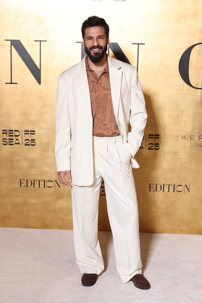 Dilan Çiçek Deniz, siyah asimetrik omuzlu tasarımı ve drapeleriyle sade ama güçlü bir duruş sergiledi. Görünümünü minimal dokunuşlarla tamamlayan oyuncu, genel atmosferle uyumlu bir zarafet yorumladı. Serkan Çayoğlu ise ekru tonlardaki geniş kesim takımıyla modern maskülenliğin dengeli bir örneğini sundu.