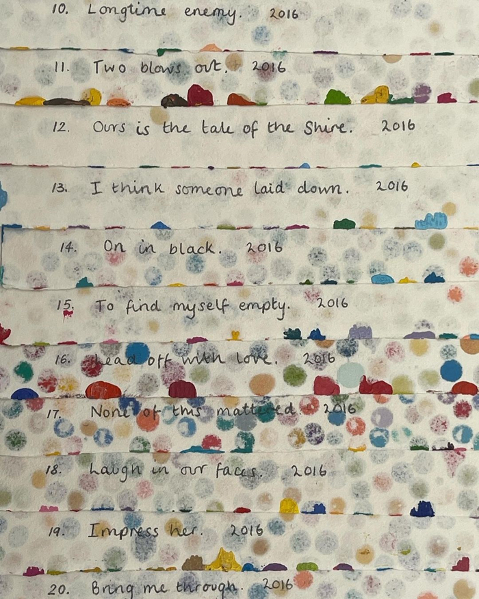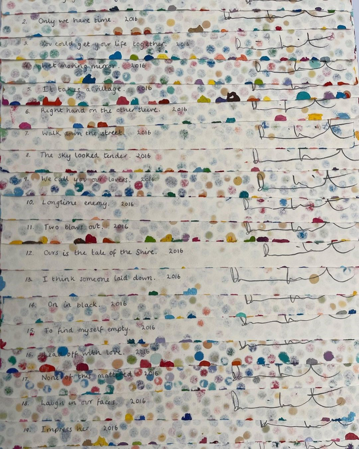 Damlama ve sıçrama miktarından boyanın dokusuna kadar her sanat eseri, birbirinden ayrı ve benzersiz bir kombinasyona sahip. Eserlerin her biri "Totally gonna sell you", "Only we have time", "You could get your life together" gibi cümlelerle isimlendirilmiş. Bu başlıklar, sanatçının en sevdiği şarkı sözlerinden 'machine learning' ile yapay zeka kullanılarak üretilmiş.