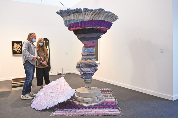 Beden ve nesne arasındaki psikolojik ilişkiyi eserlerinde ele alan sanatçı Woody De Othello'nun fuarda yer alan çalışması, endişe ve kırılganlığı kucaklıyordu. Devasa heykelinde, cihazların kullanımları aracılığıyla insan yorgunluğu ve faaliyetinin izlerini nasıl taşıyabileceğini sorgulayan sanatçı, borularla oluşturduğu enstalasyonda, bir patlamanın bedensel tehdidini gözler önüne serdi.