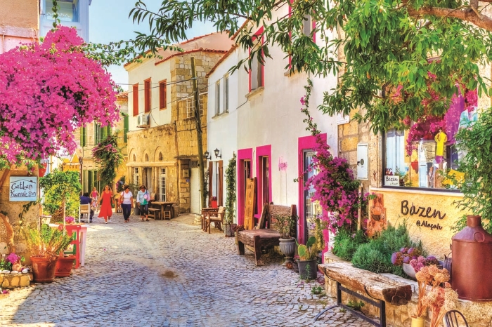 Neredeyse her balkonda bir saksı ve yüzlerce güzellikten oluşan görsel şölen. İnce ruhların ifadesi begonviller, sardunyalar, Alaçatı’nın zarafetine ve sadeliğine de bir gönderme sanki.