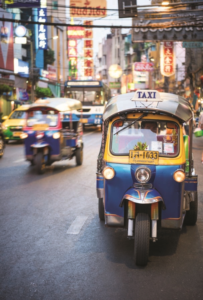 Bangkok’a ilk kez gittiğinizde kendinizi sudan çıkmış balık gibi hissetmeniz işten bile değil. Zira öyle bir kent düşünün ki, dönüşte orayla ilgili size sorulan ilk soru genellikle “Böcek yedin mi?” oluyor! Kızgın yağda kızartılmış çıtır çıtır böcekler, seyyar yemek satıcılarının tezgâhlarını süsleyen tatların en ekstrem örneği elbette. Nitekim sokak yemeği söz konusu olduğunda Bangkok, tam anlamıyla bir cennet; dünyanın en iyisi kabul ediliyor. Rayihalı noodle’lar, haşlanmış dumpling’ler, kızarmış ördekler, dilimlenmiş taze meyveler ve daha nicesi, kentin sokaklarının mutlak hâkimi. Ticari merkezi olan ve çok katlı lüks oteller, devasa alışveriş merkezleri ve gökdelenlerin gölgesindeki Sukhumvit sizi ‘geleceğe ışınlarken’ Chao Phraya nehri ile Sukhumvit’in arasında yer alan Rattanakosin, tarihî bir Uzakdoğu öyküsüne dekor olabilecek otantiklikte. Trafik deseniz, özellikle iş çıkışı saatlerinde size İstanbul’u mumla aratabilecek türde. Kentte trafik sorununu çözmek için yolların üzerinde beton desteklerle otobanlar ve sky-train’ler yükseltilmiş. Bunların trafiği çok da rahatlattıkları söylenemez, ama bu yol ağına, cepheleri elektronik billboardlarla kaplı gökdelenler de eklenince kendinizi Blade Runner setinde gibi hissederek oyalanabilirsiniz. Ayrıca, itiraf etmek gerekir ki, kentin trafiği bile çok ‘renkli’: yeşil renkli halk otobüsleri; çingene pembesi taksiler; üç tekerlekli, üstü kapalı bir motosiklet olan ve taksi olarak kullanılan mavi tuk tuk’lar ve yanlarında son model arabalar...