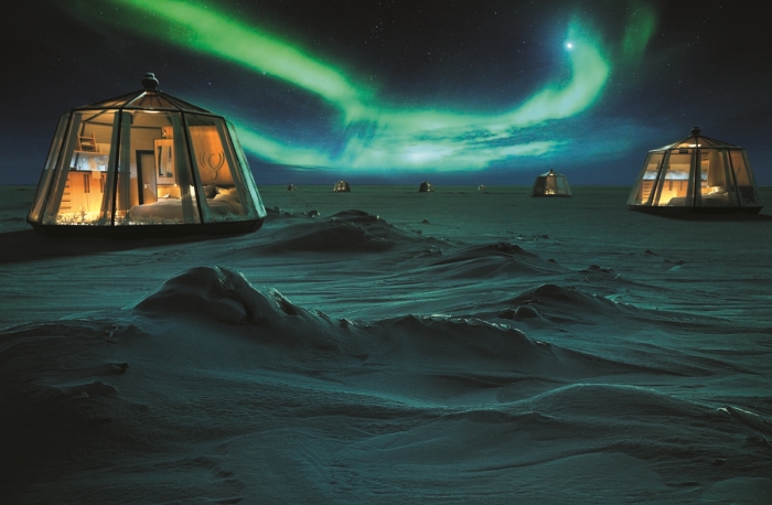 Dünya’nın bir ucunda, macerayı konfor ile buluşturan bir tatil kulağa nasıl geliyor? Turizm şirketi Luxury Action’ın “Dünya’nın en kuzeyinde yer alan oteli” unvanı ile hayata geçirdiği North Pole Igloos, taşınabilir ve ısıtmalı iglolardan oluşuyor. Hava koşullarının uygun olduğu güvenli bölgelere taşınan iglolarda konaklamak isteyenler, helikopter ile seyahat ederken doğanın olağanüstü koşullarına tanıklık etme imkanı buluyorlar. Dünyanın kuzeyine çıkmışım, Kutup noktasında tatilimi geçirmek istiyorum diyorsanız, North Pole Igloos’a Nisan ayında gitmek zorundasınız. Yılın diğer günlerinde Svalbard Arktik’i civarında seyahat eden iglolar, hava koşulları göz önünde bulundurulduğunda yalnızca Nisan ayında Kutup noktasında mola veriyorlar. Cam çatılı iglolarda doğa ile bütünleşme olanağı bulurken, Kuzey Işıkları ile büyüleneceğiniz bu tatilde size kamp şefi, Arktik doğa rehberi ve güvenlik birimi eşlik ediyor.