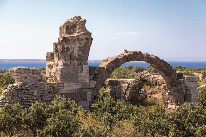 Sırada son durağımız olan, antik Troas bölgesinin, antik Ailois bölgesiyle sınırında yer alan Assos kenti var. Ezine’den güneye doğru devam ederken karşımıza çıkar Assos. Karşısında Ege Denizi’nin koyu lacivert ve buz gibi sularının ardında, Antik Yunanistan’ın en ünlü şairlerinden olan ve lirik şiirin öncüsü Sappho’nun memleketi Midilli (Lesbos) adası görünür. Kıyı kısmından en tepeye kadar Antik Yunan, tepenin deniz görmeyen kısmı ise bir Osmanlı yerleşkesi, günümüzün Behramkale’si. Tarihi M.Ö. 8. yüzyıla dayanan bu antik Yunan kentini, Osmanlı’nın Behramkale’sinden zirvedeki Athena tapınağı ayırır. Güneş batışını izlemek için de harika bir nokta olan bu tapınağın belki de Anadolu arkeolojisi açısından en çok ilgi gören noktası ise Anadolu’daki ilk ve tek dor düzenekli inşa edilmiş olan tapınak olması. Bu tepeden aşağı doğru ise kent halka halka limana doğru genişliyor. Şehri çevreleyen surlar, nekropol (ölüler kenti, mezarlık), akropol, agora ve tiyatro bu kentten günümüze kalanlar arasında. Assos’u ziyaret etmeyi cazip kılan diğer bir nokta ise M.Ö. 340’larda burada bir felsefe okulu kuran ve bir süre yaşayan Aristo’nun anısına 2000 senesinden beri her sene “Assos’ta Felsefe” adıyla düzenlenen etkinliklere ev sahipliği yapması. Athena tapınağına çıkarken de bizi ilk olarak Aristo heykeli selamlıyor zaten. Deniz kıyısına vardığımızda ise hala kullanılan antik bir liman, daracık sokaklar ve sokaklarda boylu boyunca dizili taş evler bulunuyor. Assos’tan bahsederken Assos taşı olarak da bilinen andezitten bahsetmeden olmaz. Çok sert ve işlemesi zor fakat bir o kadar da dayanıklı bir taş andezit. Assos da sapasağlam andezit kayaların üstüne kurulmuş bir kent zaten. Günümüzde tatil beldesi olan diğer antik kentlerin aksine, çok daha sakin ve huzurlu Assos. Tarihi öneminden ötürü imara açılmaması ve andezit kayalarla kaplı dik bir tepeye kurulmuş olması da fazla turist almamasına neden oluyor. Ziyaretçiler ise 2000 yıllık limandan Kuzey Ege’nin buz gibi sularına girebiliyorlar.