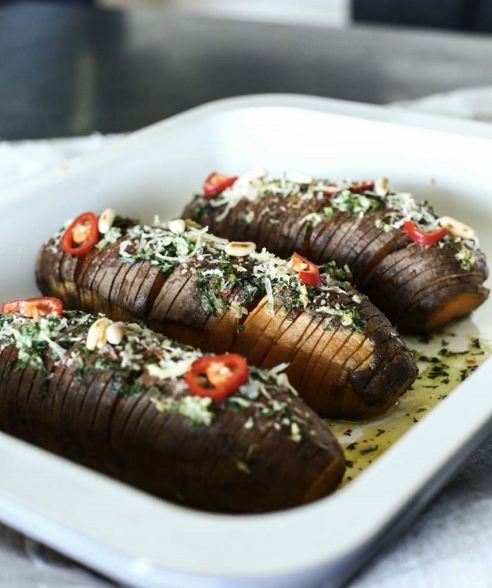 Tatlı patateslere akordeon gibi ince kesikler atın, tabanını kesmemeye özen gösterin. Üzerine biraz zeytinyağı ve tuz-karabiber gezdirip folyo içine sararak 200 derecede yumuşayana dek yaklaşık 25 dakika fırınlayın.