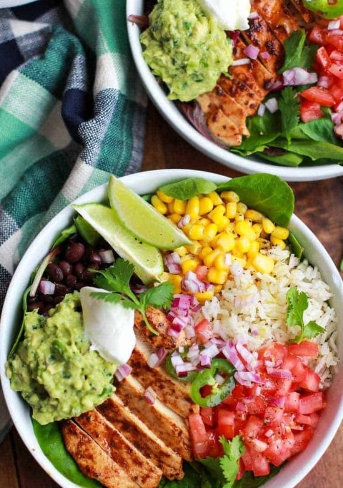 Orta yüksek ısıda bir ızgarayı, ızgara tavasını veya tavayı önceden ısıtın. Tavuğu ekleyin ve her iki tarafta veya pişene kadar 5-6 dakika pişirin. Haşlanmış tavukları lokma büyüklüğünde doğrayın. Pirinci geniş bir kaba koyun; kişniş, limon suyu, tuz ve karabiberi ekleyip haşlayın. Haşladığınız pirinçleri tabağın tabanına alın ve üzerine marulları, küp küp doğradığınız köz biberi, Meksika fasulyesi, avokado ve dilimlediğiniz tavukları ekleyin. Üzerine biraz tuz ve 1 tatlı kaşığı zeytinyağı ve yoğurdu ilave edin.