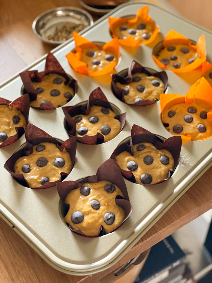 5. Yağladığınız muffin kaplarına hazırlamış olduğunuz karışımı paylaştırın ve üzerlerine doğranmış veya damla çikolata ilave edin.