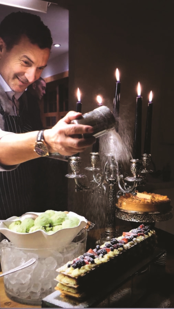 Ceviche sos için arpacık soğanlar sotelenir, rendelenmiş yeşil elmalar eklenir. Soya sosu, zeytinyağı ve pirinç sirkesi eklenir. Simmer’da 5 dakika piştikten sonra robottan çekilir. Zeytinyağı tozu maltosec ve zeytinyağı robotta birbirine karıştırılır. Tigermilk için portakal, greyfurt, limon ve lime suyu; tabasco, kişniş tohumu ve sarımsak ile bir gece dinlendirilip süzülür. Chilli sos için 250 gr kırmızı şarap sirkesi fine burnoise doğranmış 5 adet chilli biberi ile birlikte ocakta çektirilir. İçerisine 100 gr toz şeker eklenip soğutulur. Burnoise doğranmış yeşil elmalar chilli sos ile marine edilir. Üzerine tigermilk’te 1 dk pişirilmiş levrek parçaları koyulur. Üzerine dilimlenmiş mürdüm eriği ve kırmızı soğan koyulur. Ortasına ceviche sos sıkılır. En son zeytinyağı tozu koyulur. Levreklerin üzerine maldon tuz eklenerek bitirilir.