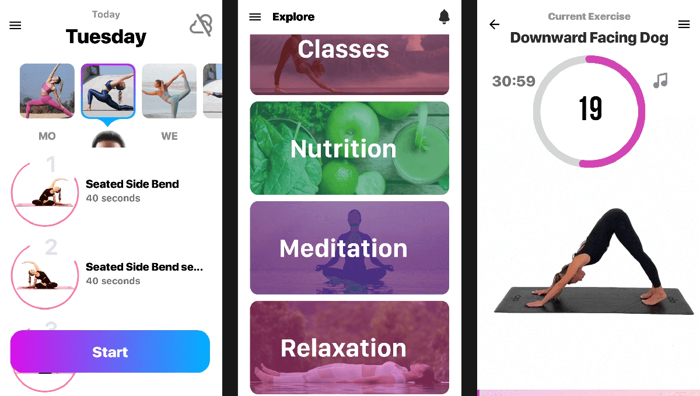 Bu uygulama, sınırlı alanda çalışmayı ve başlangıç seviyesindeki temel yoga pozisyonlarını nasıl yapacağınızı öğrenmeyi en kolay hale getirir. Antrenmanlarınız sırasında, küçük yaşam alanınızda nihai stressiz atmosferi yaratmak için uygulama içindeki sesleri veya melodileri dinleyebilirsiniz. Keşfet üzerine dokunarak meditasyon veya rahatlama derslerine katılabilirsiniz.