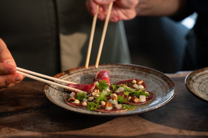 Menüdeki tabaklar da bu ortak hikayeyi çok güzel anlatıyor. Örneğin, açılışı yapan Sırlanmış Lüfer, Emre Şen'in lezzet dilini yansıtıyor; kendi hazırladığı mandalina yağı, tane hardal ve çam fıstığıyla onun mutfağına bir giriş niteliği taşıyor. Tütsülenmiş Et Tataki ise iki mutfağın buluşma noktası: Tabağın temel yapısı Şef Şen'den gelirken, trüflü ponzu, karamelize pekan cevizi ve daikon turşusu ile Roka'nın teknik ustalığı ve hassas tat dengesiyle ortak bir yoruma dönüşüyor. Belki de gecenin en dikkat çekeni, Şen'in tat hafızasının Roka'nın imza pişirme tarzıyla birleştiği Kuzu Gyoza. Parmesan köpüğü, kestane ve yanık tereyağı gibi beklenmedik eşlikçilerle sunulan bu tabakta, Şen'in lezzet tercihleri korunarak mutfağın yaratıcı uygulamasıyla bütünlük sağlanıyor.